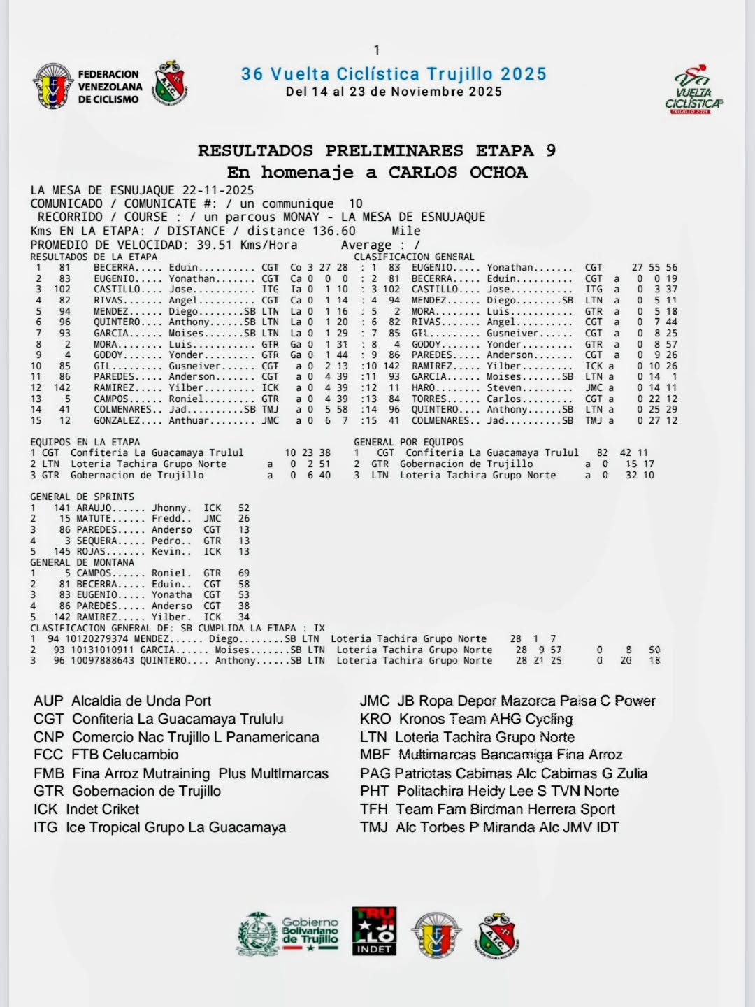 La 36ª Vuelta Ciclística a Trujillo 2025 celebró este sábado su jornada reina, la novena etapa, que se disputó entre Monay y el duro ascenso de 1ª categoría a La Mesa de Esnujaque sobre un trazado de 136.6 kilómetros. La prueba resultó ser la confirmación del absoluto dominio del equipo Confitería La Guacamaya, que sentenció la carrera a su favor con una impecable estrategia.